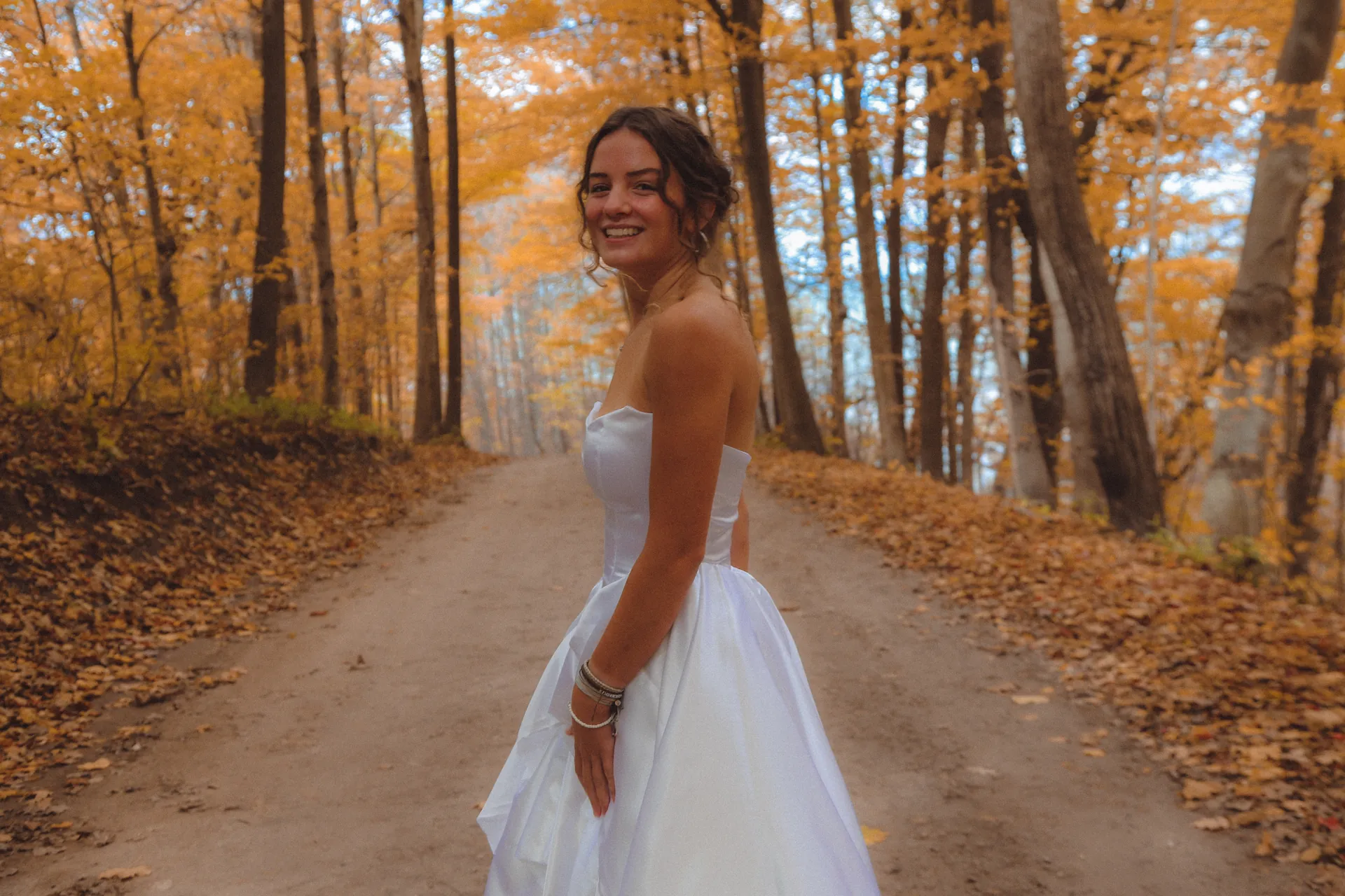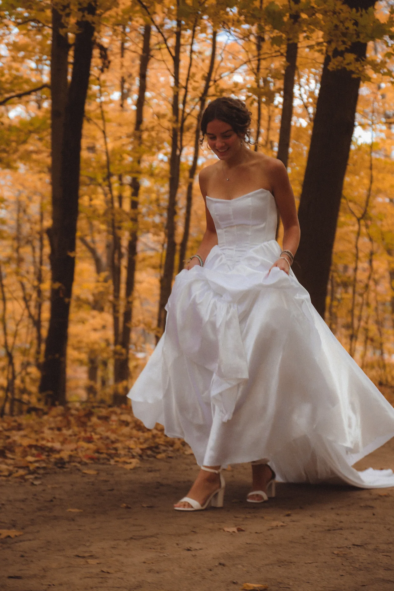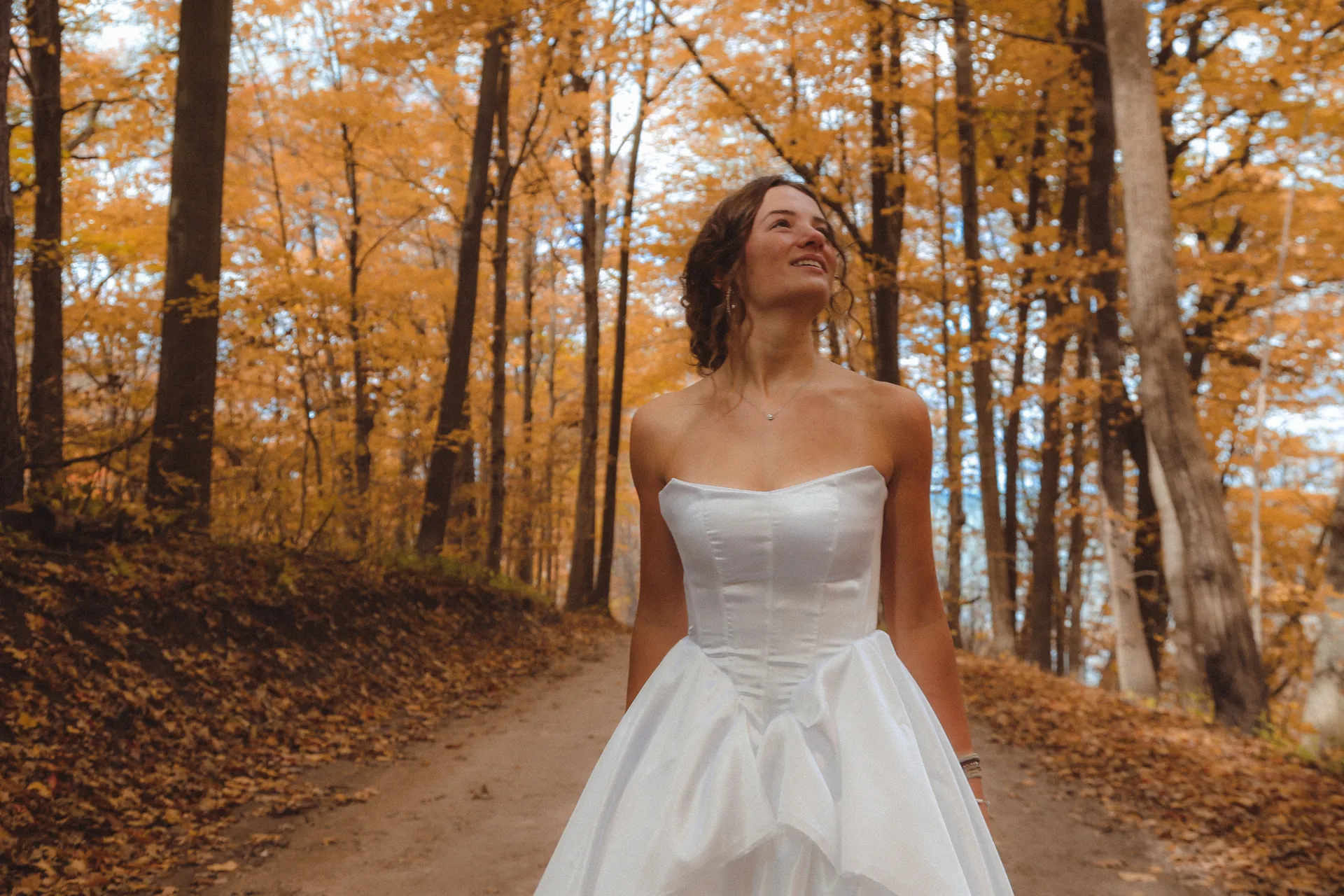 Perfect for a fairytale wedding, this timeless A-line gown was crafted with a beautiful, pure white satin. The front of the skirt is decorated with four ornate layers made to move and dance as the elegant train paints a picture of graceful beauty. The cat eye neckline and V shaped boning accentuates the bride's natural features, capturing a story of ageless beauty as the bride prepares to walk the aisle.